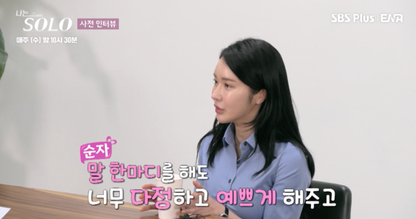순자는 계속 밝은 모습을 보여주는 청순한 인상을 가진 나는솔로 15기 여성출연진입니다.